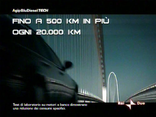 La pubblicità dell’Agip che ci bersaglia da settimane, con quell’auto che scorre sul ponte di Calatrava, promettendo 500 km in più ogni 20.000 km utilizzando il suo diesel speciale, ci darà dei dati veri o falsi?