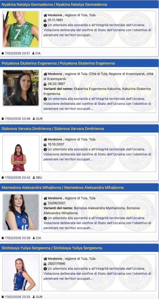 Nel sito Myrotvorets al menu “Purgatorio” trovate i più recenti nomi inseriti tra i pericolosi nemici della sicurezza dell’Ucraina. Si vede anche chi è stato il segnalatore e nell’ordine vediamo: CIA, GUR, SBU, CIA, GUR, più sotto appare anche NATO, NSA, FBI, XUNTA, MI5…