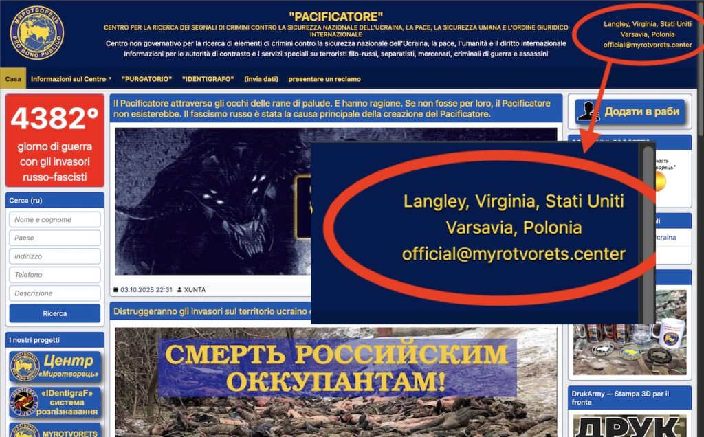 Questa è la schermata parziale della home di Myrotvorets.center, notare il contenuto dell’ingrandimento in alto a destra. Avete visto?