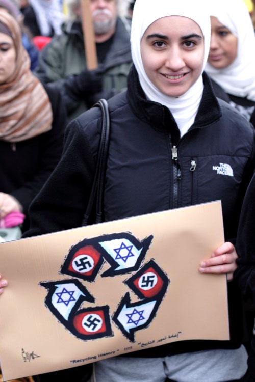 Foto trovata su Wikipedia, la didascalia dice: “Una giovane donna mostra il ciclo della violenza: a suo dire, Israele sarebbe una diretta conseguenza del nazismo e viceversa”.
