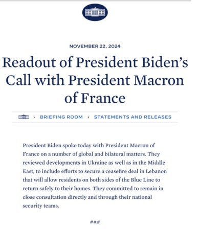 Ora inizierà in ping-pong infinito tra le varie cancellerie e amministrazioni politiche dei paesi NATO che più di ogni altro aveva voluto e appoggiato l’attacco in profondità in Russia con i nuovi missili forniti all’Ucraina. Ci sarà uno scarica barile delle responsabilità per la reale minaccia che rappresenta il nuovo gioiellino russo? Ad esempio la telefonata protocollata tra Macron e Biden: