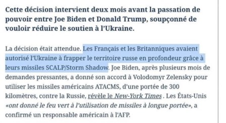 Il quotidiano Le Figaro, che aveva riferito che Francia e Gran Bretagna erano d’accordo sull’uso da parte dell’Ucraina di missili SCALP/Storm Shadow a lungo raggio per attacchi sul territorio russo, ha cancellato questa informazione. (Soloviev) via Telegram
