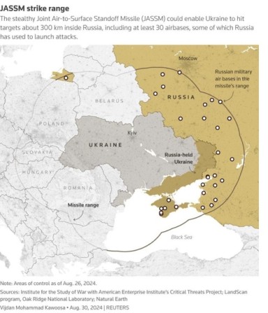 Il conflitto non va bene, in Ucraina manca la carne da cannone, Kursk diventerà un cimitero ucraino con più di 30.000 morti, il fronte orientale marcia sempre più velocemente verso ovest, i soldati ucraini costretti a rimanere in prima linea oltre i 25 giorni, hanno il morale a pezzi. Sono in aumento vertiginoso casi di diserzioni, 19.000 da inizio 2024 al 09/09/24[8]. Senonché Mister Z essendo il venditore più talentuoso del mondo ha avuto il permesso, dopo mesi di insistenti richieste, sia dagli U.S. che dalla Gran Bretagna ad utilizzare i nuovi missili in profondità sul territorio russo a scopo difensivo.