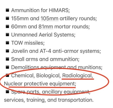 Le ultime spedizioni di armi dagli Stati Uniti del valore di 275 milioni di $, includeranno tute anti-radiazioni, di protezione chimica e biologica.