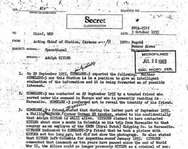 Di recente la CIA, il 21 marzo 2025, ha declassificato il documento HVCS-2592, risalente al 2 ottobre 1955 e microfilmato il 26 luglio 1963, da cui emerge che Adolf Hitler non è morto a Berlino – come i libri della storia scritta dai vincitori hanno raccontato, bensì era vivo e si trovava in Sudamerica, da dove collaborava con gli americani. Per un certo periodo si era perfino diffusa la voce che Hitler fosse morto in Namibia dove tutt’ora c’è una piccola comunità che parla tedesco.