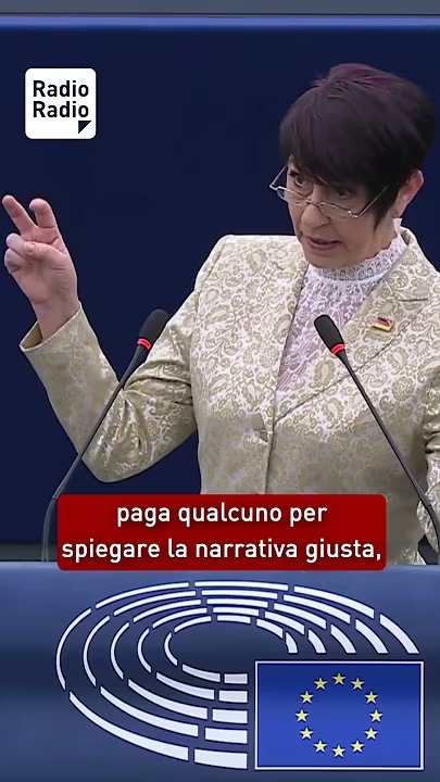 Questo a riprova che i parlamentari UE coraggiosi, che non hanno timore di smerdare la falsa democrazia della Commissione UE, non mancano. Purtroppo hanno diritto di parola per pochi minuti e quando la sede europarlamentare è quasi vuota. Ma tutto ciò che viene detto rimane agli atti e i video possono essere diffusi, replicati, ascoltati, letti con sottotitoli in tutti i 27 stati dell’UE. Peccato per questa parlamentare che in base alla bandierina che mostra nel risvolto della pregiata giacca che indossa, il suo paese è in cima alla lista di coloro che ritengono giusto ammaestrare la democrazia. La Germania per armarsi in previsione di un conflitto contro la Russia entro il 2029-2030 deve fare uno sforzo elevato per educare le “scimmie” del suo paese. Comunque le auguro d’essere almeno ascoltata negli altri 26 paesi.