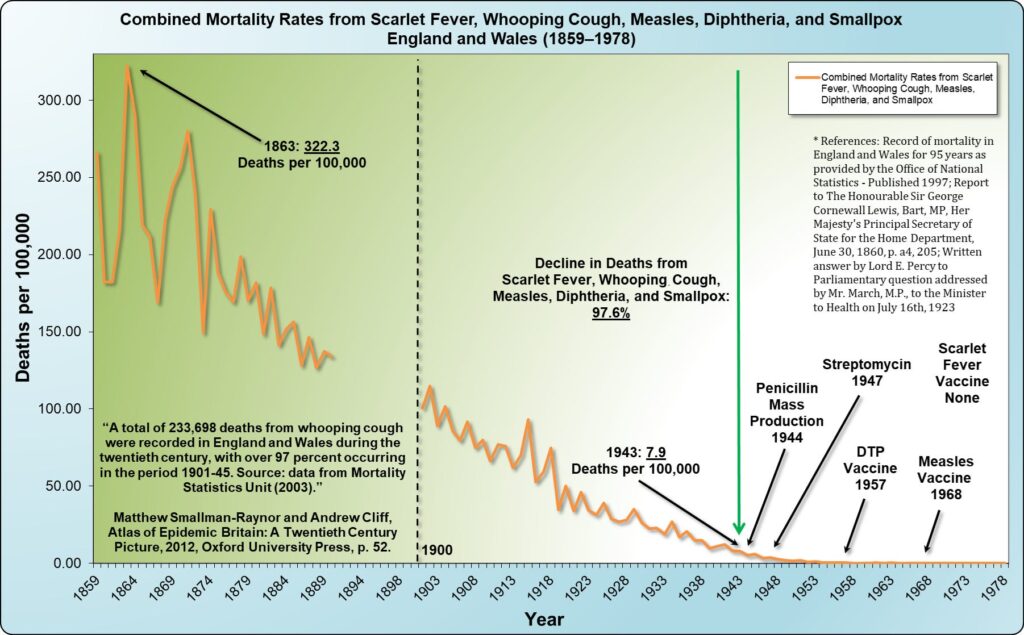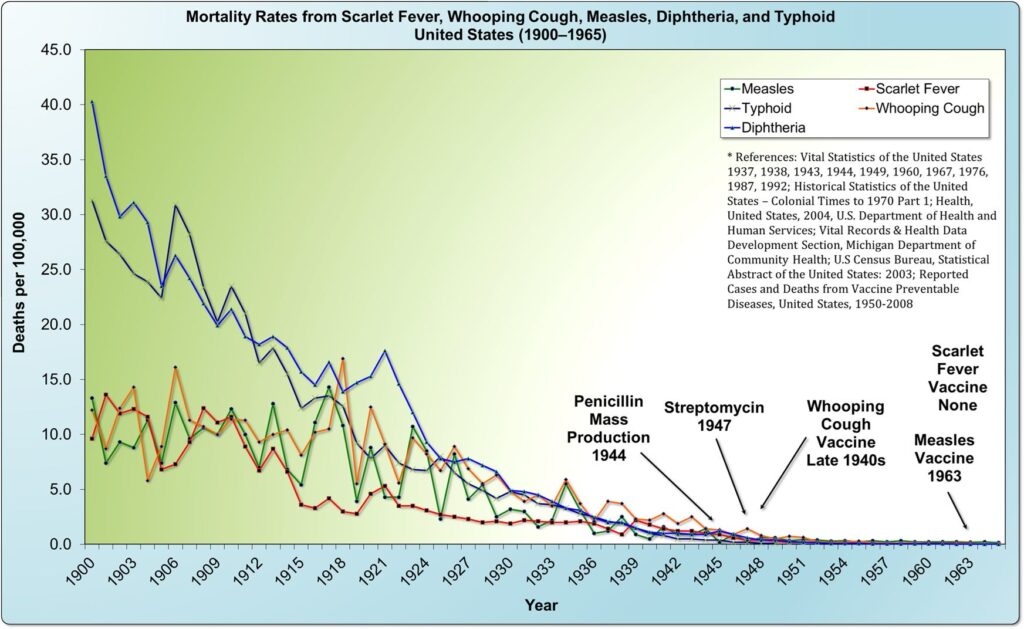 Se si sommano i tassi di mortalità per scarlattina, pertosse, morbillo, difterite e vaiolo, emerge uno schema sorprendente: un calo dei decessi di quasi il 98% si è verificato prima della produzione di massa della penicillina.