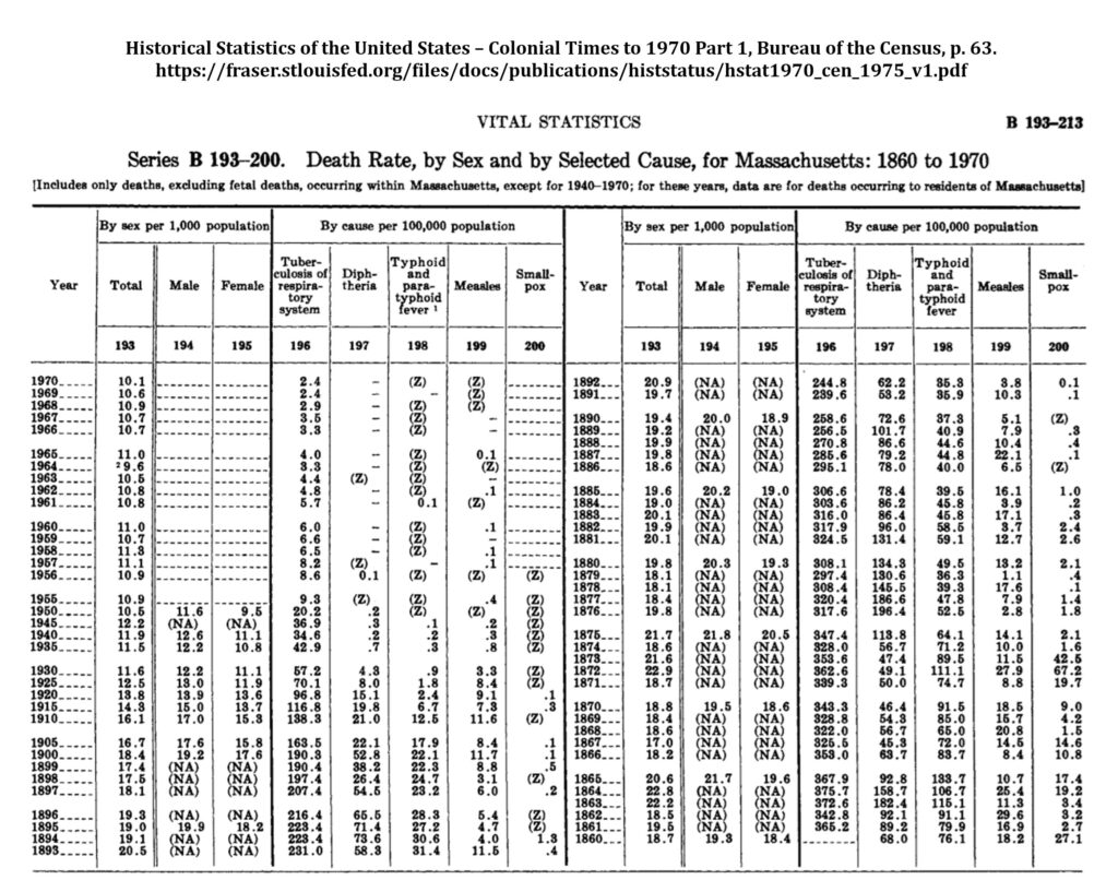 “C’è stato un declino continuo, uguale per entrambi i sessi, dal 1937 in poi. La vaccinazione [per la pertosse ], iniziata su piccola scala in alcuni luoghi intorno al 1948 e su scala nazionale nel 1957, non ha influenzato il tasso di declino se si presume che un attacco di solito conferisca immunità, come nella maggior parte delle principali malattie trasmissibili dell’infanzia… Con questo modello ben consolidato prima del 1957, non vi è alcuna prova che la vaccinazione abbia svolto un ruolo importante nel declino dell’incidenza e della mortalità nell’andamento degli eventi.” 5