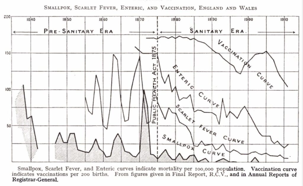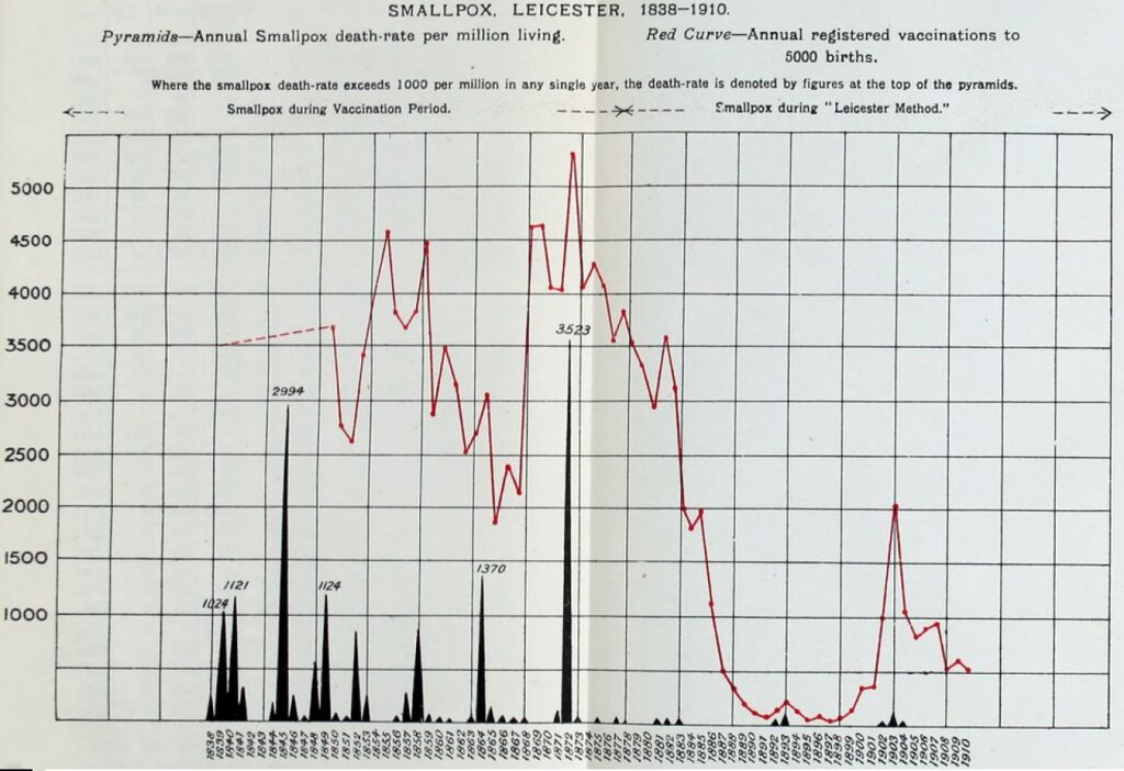 Nel 1912, JT Biggs presentò un’analisi convincente nel suo lavoro Sanitation Versus Vaccination , includendo un diagramma che rispecchiava la scoperta del Dr. Millard. 12 Biggs si concentrò su Leicester, in Inghilterra, e mostrò un modello sorprendente: i decessi per vaiolo diminuirono dopo una grave epidemia nel 1872, anche se i tassi di vaccinazione erano elevati durante l’epidemia. Tuttavia, quando i tassi di vaccinazione iniziarono a diminuire, i decessi per vaiolo continuarono a diminuire e rimasero bassi nonostante la ridotta copertura vaccinale.