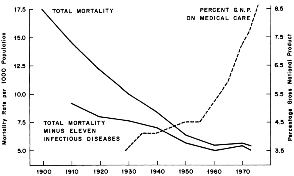 - John B. McKinlay e Sonja M. McKinlay, “Il contributo discutibile delle misure mediche al declino della mortalità negli Stati Uniti nel ventesimo secolo”, The Milbank Memorial Fund Quarterly, Health, and Society, vol. 55, n. 3, estate 1977, p. 425. ↩︎
