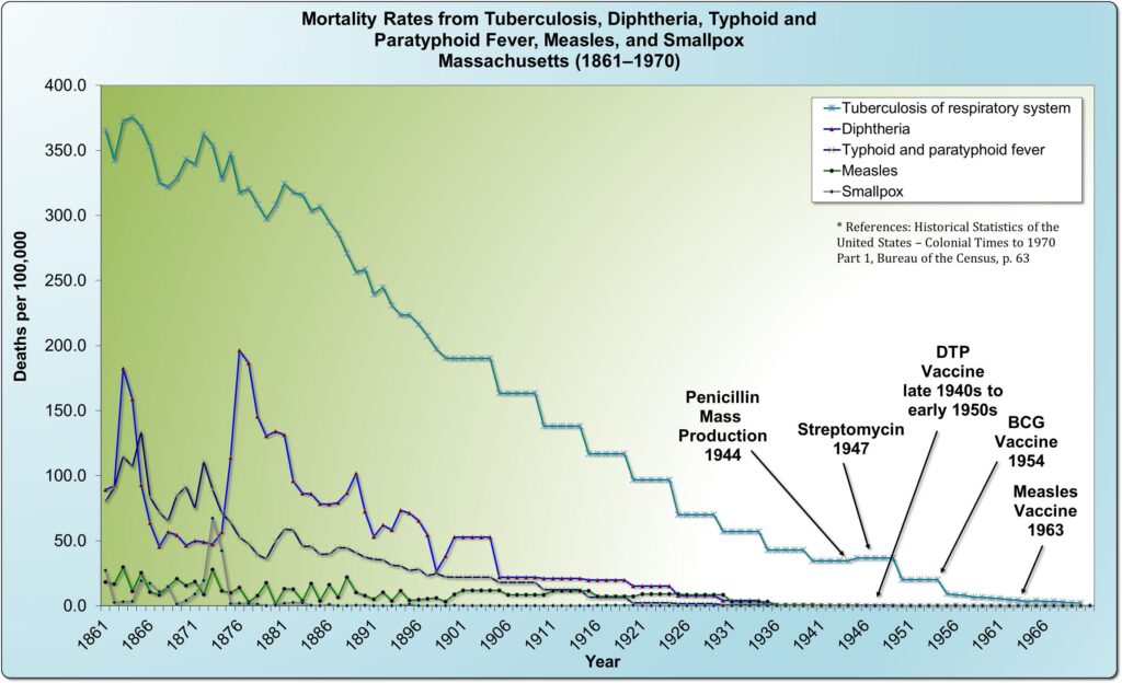 “…quasi il 90% del calo della mortalità per malattie infettive tra i bambini degli Stati Uniti si è verificato [dal 1900] prima del 1940, quando erano disponibili pochi antibiotici o vaccini .” 8