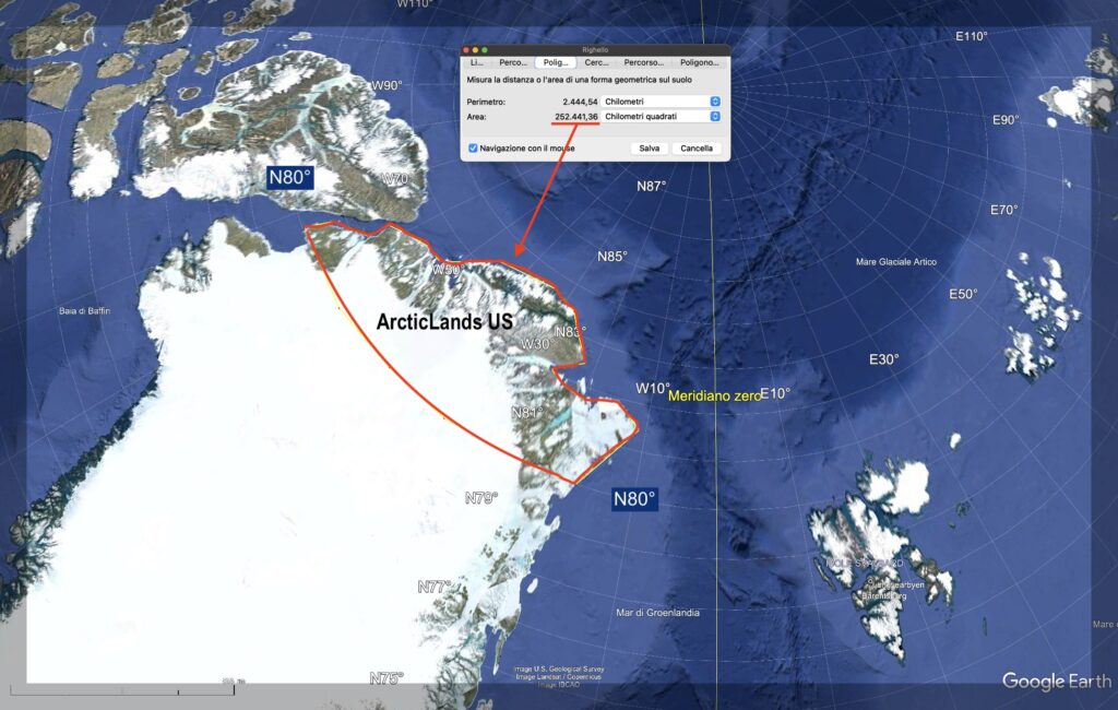 Ora guardando cosa rimane a nord dell’80° parallelo, scopriamo tramite Google Earth, che c’è un territorio di circa 252.000 Km2, l’Italia è 302.000 Km2, quindi, abbastanza grande da poter installare basi militari, fare esplorazioni minerarie ed iniziare a mettere a profitto a seguito di un accordo di affitto, ipotizziamo, da 500 milioni di $/anno.