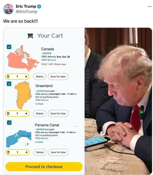Fin dal 2024 quando era in campagna elettorale ha mostrato delle “fisse”, appena eletto ha cercato di mettere a fuoco qualche facile annessione di territori (vedi immagine di copertina), tanto sono amici, quelli dicono sempre di sì! Eh, certo siamo qui che aspettiamo a 90°! 🖕