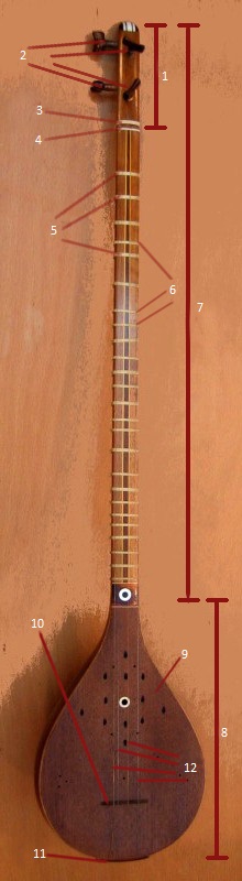 ![]() | Parts of the Iranian setar: 1. Pegbox 2. Pioli 3. Premere sopra il dado 4.Noce 5. Tasti principali 6. Tasti laterali o tasti secondari 7. Collo8. Ciotola 9. Fori sonori 10. Ponte 11. Portacorde o portafilo 12. Corde By fa:کاربر:Leyth and w:User:Shabdiz – Original was a Wikimedia Commons image:File:Setar-PointingLines.jpgThe image was also derived from a Wikimedia Commons image:File:Setar.jpg, Public Domain, https://commons.wikimedia.org/w/index.php?curid=100214181 |